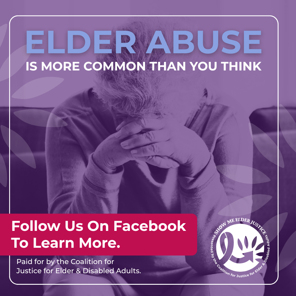 Show Me Elder Justice is a public awareness campaign for Missouri, presented by the Coalition for Justice for Elder and Disabled Adults. Together, we are shining a light on the realities of elder abuse, neglect, and exploitation and taking action. You are part of building a safer, more just Missouri where older adults and adults with disabilities are treated with the dignity, respect, and protection they deserve.